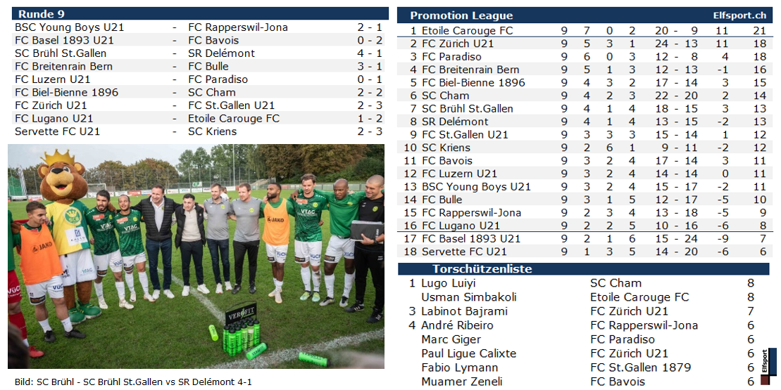 Hoval Promotion League - 2023/2024 1. Etoile Carouge FC 9/21, 2. FC Zürich U21 9/18, 3. FC Paradiso 9/18, 4. FC Breitenrain Bern 9/16, 5. FC Biel-Bienne 1896 9/15, 6. SC Cham 9/14, 7. SC Brühl St.Gallen 9/13, 8. SR Delémont 9/13, 9. FC St.Gallen U21 9/12, 10. SC Kriens 9/12, 11. FC Bavois 9/11, 12. FC Luzern U21 9/11, 13. BSC Young Boys U21 9/11, 14. FC Bulle 9/10, 15. FC Rapperswil-Jona 9/9, 16. FC Lugano U21 9/8, 17. FC Basel 1893 U21 9/7, 18. Servette FC U21 9/6