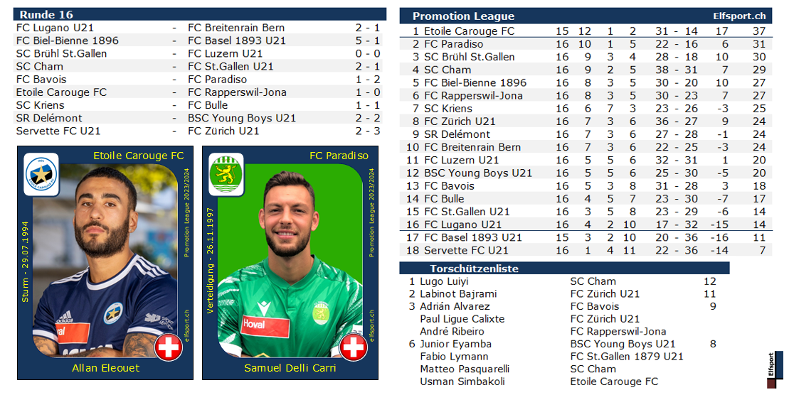 Hoval Promotion League - 2023/2024 1. Etoile Carouge FC 15/37, 2. FC Paradiso 16/31, 3. SC Brühl St.Gallen 16/30, 4. SC Cham 16/29, 5. FC Biel-Bienne 1896 16/27, 6. FC Rapperswil-Jona 16/27, 7. SC Kriens 16/25, 8. FC Zürich U21 16/24, 9. SR Delémont 16/24, 10. FC Breitenrain Bern 16/24, 11. FC Luzern U21 16/20, 12. BSC Young Boys U21 16/20, 13. FC Bavois 16/18, 14. FC Bulle 16/17, 15. FC St.Gallen U21 16/14, 16. FC Lugano U21 16/14, 17. FC Basel 1893 U21 15/11, 18. Servette FC U21 16/7 Die ersten sieben Mannschaften qualifizieren sich für den Schweizer Cup 2024/2025 - die Nachwuchsteams/U21 sind davon ausgeschlossen.